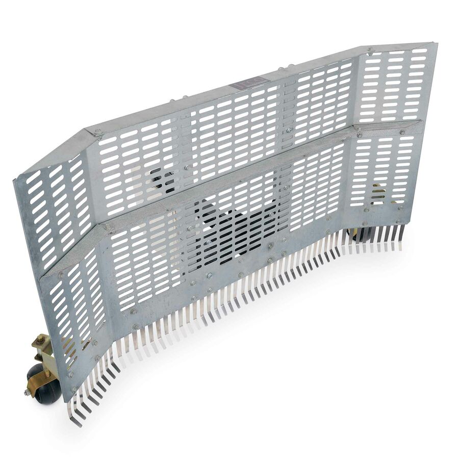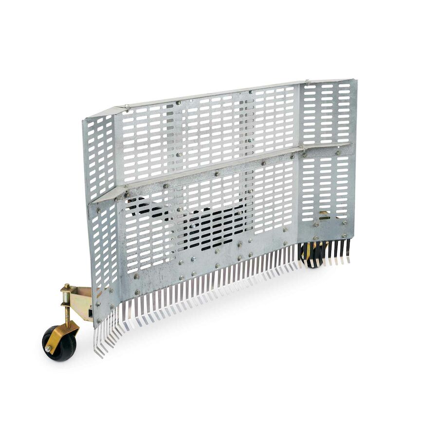 The heavy-duty GrandStand MULTI FORCE Leaf Blade Plow attachment uses the mower's power to quickly move piles of leaves. It virtually eliminates in.tarping in. and moves windrowed leaves for collection. The one-piece, 55 in. (139.7 cm) wide galvanized steel blade has supports at the top, center and bottom for durability. The Leaf Blade rides on two adjustable caster wheels. Flat 4.5 in. (11.4 cm) long stainless spring steel tines allow the Plow to push leaves on uneven surfaces without damaging turfgrass. The Leaf Blade may be folded up over the deck to reduce space on the trailer.
